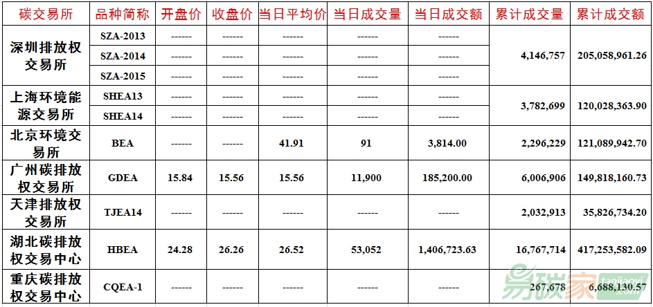 品種HBEA成交53,052噸,成交額1,406,723.63元,收盤價26.26元,較前一交易日下跌2.67%。截止當日,湖北碳市場配額總成交量16,767,714噸,總成交額417,253,582.09元。