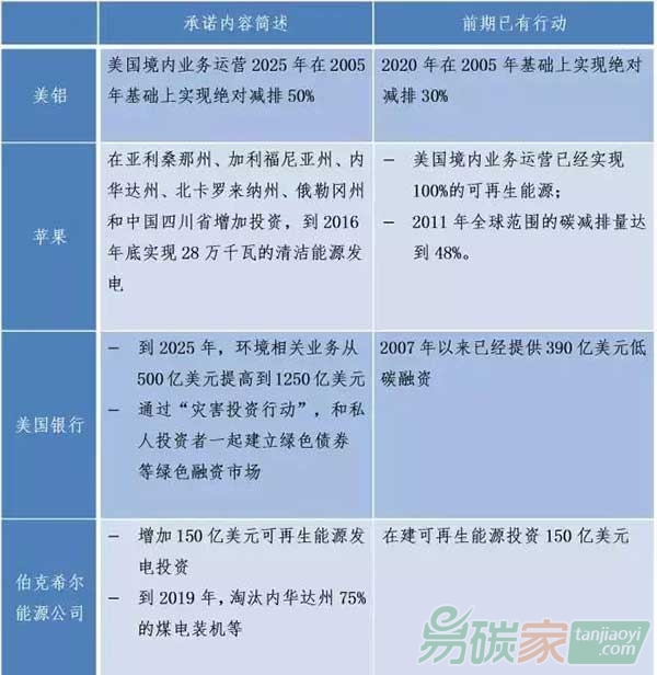 減排行動,支持奧巴馬政府應(yīng)對氣候變化行動,簽署并承諾了各自的應(yīng)對氣候行動措施。未來美國企業(yè)在低碳領(lǐng)域新增投資將超過1400億美元,新增可再生能源160萬千瓦。