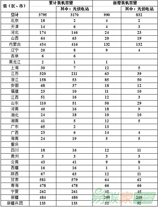 全國(guó)各?。▍^(qū)、市)中,累計(jì)光伏發(fā)電裝機(jī)容量超過100萬千瓦的達(dá)9個(gè),分別為新疆(含兵團(tuán))617萬千瓦、甘肅581萬千瓦、