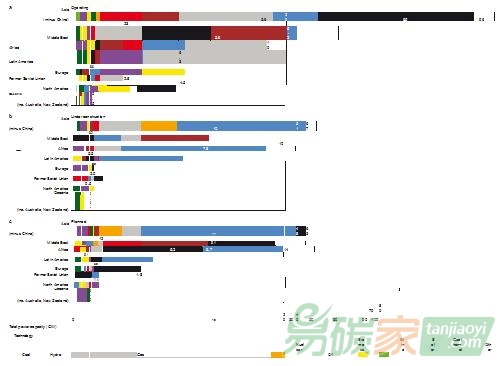 聯(lián)合國氣候變化框架公約并未意識到,中國企業(yè)(通常是中國國有銀行在其背后提供政策支持)在發(fā)展中國家能源領(lǐng)域中提供了大量的資金和技術(shù)支持:在70個國家建了超過300個大壩工程8;在非洲的太陽能、生物燃料、輸變電及水電項目上投資約220億美元9;中國企業(yè)也正逐漸成為南亞和東南亞燃煤電廠設(shè)備的主要供應(yīng)商和投資商10。在過去十年中,中國同時也是123個國外風(fēng)能、太陽能項目的投資商,而且這些項目大部分是在發(fā)達國家11。在國際投資中,中國已成為世界上出口信貸投資額最大的國家,其中能源領(lǐng)域是個重點12。通過一項對中國企業(yè)在全球能源領(lǐng)域運行的地域分布的獨立分析,可以知道其在能源領(lǐng)域的對外投資規(guī)模(圖1)。