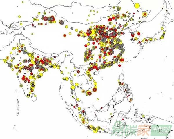 圖注:中國不同省份不同階段的燃煤發(fā)電廠裝機(jī)容量比較(灰色:2010年以后開始運(yùn)行的燃煤發(fā)電廠,紅色:正在建設(shè)中的燃煤發(fā)電廠,黃色:計(jì)劃修建的燃煤發(fā)電廠,圓點(diǎn)大?。貉b機(jī)量大小,數(shù)據(jù)截止到2016年1月)