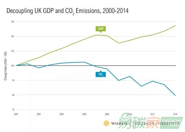 這21個國家中有些是前蘇聯(lián)東歐國家正處于經(jīng)濟轉(zhuǎn)型期,不具代表性。但值得一提的首先是美國,這個世界最大的經(jīng)濟體從2000年到2014年GDP總量增長幅度為28%,但二氧化碳排放量下降了6%。英國的表現(xiàn)更是搶眼,2000年到2014年GDP增幅27%,但碳排放總量下降達20%。