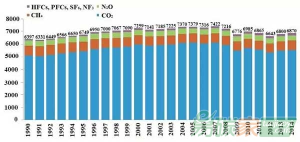 2016年4月15日,美國(guó)環(huán)境保護(hù)署(EPA)發(fā)布《美國(guó)溫室氣體清單報(bào)告:1990—2014》(U.S. Greenhouse Gas Inventory Report: 1990-2014),回顧了自1990年以來(lái)國(guó)家層面的年際溫室氣體排放情況,報(bào)告指出:2014年美國(guó)溫室氣體排放為6870 MMT CO2e,比2013年增加了1%,自2005年降低了9%(圖1)。
