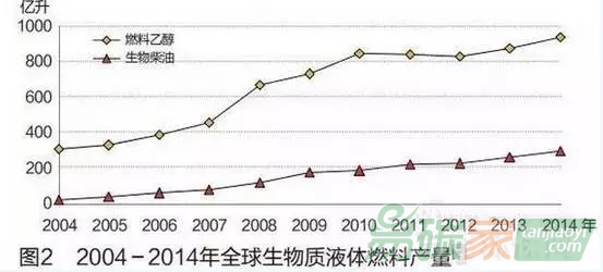 全球生物質(zhì)液體燃料產(chǎn)業(yè)規(guī)模增速顯著,2004-2014年燃料乙醇產(chǎn)量平均每年增長11.7%,生物柴油產(chǎn)量平均每年增長29.7%(見圖2)。