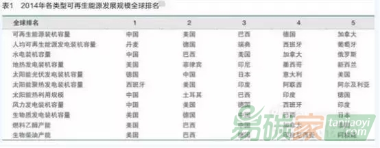 中國在發(fā)展可再生能源的道路上已邁出實(shí)質(zhì)性步伐,2014年中國可再生能源發(fā)電總裝機(jī)容量以及水電和風(fēng)電裝機(jī)容量均排名全球第一,太陽能光伏發(fā)電裝機(jī)容量排名第二,生物質(zhì)發(fā)電裝機(jī)容量和燃料乙醇產(chǎn)能均排名第三(見表1)。