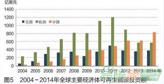 近年來中國的可再生能源投資高速增長,從2013年起超越歐洲和美國(見圖5),2014年占全球發(fā)展中國家可再生能源新增投資的2/3。