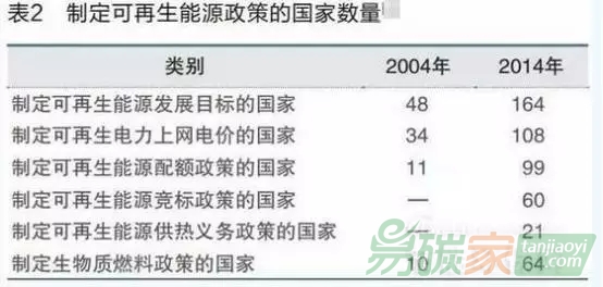 可再生能源的發(fā)展很大程度上受到政府政策的影響。在過去的十年中,制定并執(zhí)行可再生能源支持政策的國家和地區(qū)數(shù)量迅速增長(見表2)。截至2014年底,已有164個(gè)國家確定了可再生能源發(fā)展目標(biāo),145個(gè)國家頒布了相應(yīng)的支持政策。