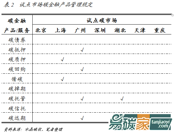 從試點開始至今,北京、上海、廣州、深圳、湖北5個試點市場已推出了近20種碳金融產(chǎn)品(參見表1)。以興業(yè)銀行為代表的股份制銀行,是目前我國參與碳金融市場最為積極的金融機構(gòu)。興業(yè)銀行作為全國首家采納“赤道原則”的銀行,不僅深耕綠色金融,在綠色金融領(lǐng)域也領(lǐng)先全國。興業(yè)銀行自2007年起便率先參與國內(nèi)碳交易市場建設(shè),目前已與全部7個試點碳市場達成合作關(guān)系,在碳交易制度設(shè)計咨詢、交易及清算系統(tǒng)開發(fā)、碳資產(chǎn)質(zhì)押授信、節(jié)能減排項目融資等方面提供一攬子產(chǎn)品與服務(wù)。2014年11月上線的深圳碳交易代理開戶系統(tǒng),是全國首個也是唯一基于銀行網(wǎng)上平臺進行碳交易代理開戶的系統(tǒng),參與碳交易市場的國內(nèi)機構(gòu)和個人可通過該行個人網(wǎng)銀直接開通深圳排放權(quán)交易所賬戶。此外,興業(yè)銀行開發(fā)了碳資產(chǎn)評估工具、國際碳資產(chǎn)質(zhì)押授信業(yè)務(wù)、碳減排量銷售協(xié)議、碳交付保函、CCER交易結(jié)算和資金存管、碳排放權(quán)質(zhì)押貸款等業(yè)務(wù),均開創(chuàng)了國內(nèi)先河,形成了國內(nèi)首家推出涉及碳交易前、中、后臺全產(chǎn)業(yè)鏈的碳金融綜合服務(wù)機構(gòu)。