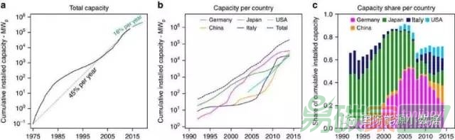 在考慮了光伏組件生產(chǎn)時(shí)間與地點(diǎn)的情況下,Wilfried van Sark博士的團(tuán)隊(duì)計(jì)算得出1975年全球光伏組件在全生命周期內(nèi)(假設(shè)為30年)的碳排放平均為400-500克/千瓦時(shí),而2015年全球平均的光伏組件在全生命周期內(nèi)的碳排放僅為20克/千瓦時(shí)。1975年每塊光伏組件需要20年的運(yùn)行時(shí)間才能回收生產(chǎn)該光伏組件所消耗的能量,而2015年光伏組件的能量回收期不到2年??傮w來看,每當(dāng)全球光伏裝機(jī)容量加倍,光伏組件能耗就下降生產(chǎn)就下降大約12%,碳排放下降17-24%。