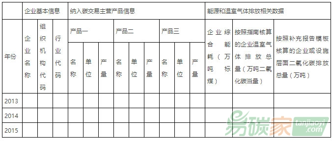 從上表可以看出,匯總表要求填寫2013-2015年的企業(yè)名稱、組織機構(gòu)代碼、行業(yè)代碼、產(chǎn)品產(chǎn)量、企業(yè)綜合能耗、按照指南核算的企業(yè)溫室氣體排放總量和按照補充報告模板核算的企業(yè)或設(shè)施層面二氧化碳排放總量。這些信息和數(shù)據(jù)的填寫要求為: