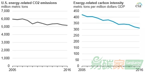 圖3: 美國(guó)能源相關(guān)的碳排放變化2005-2016(數(shù)據(jù)來源:美國(guó)能源信息管理局)