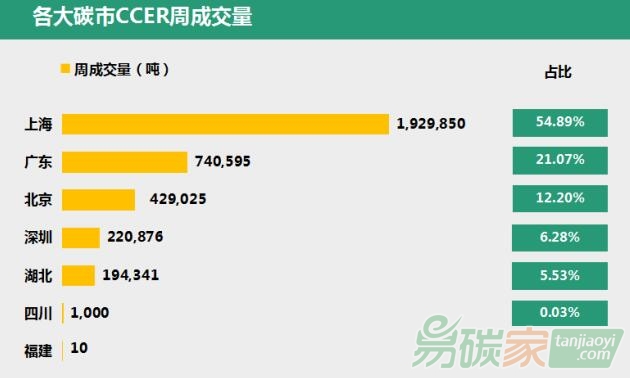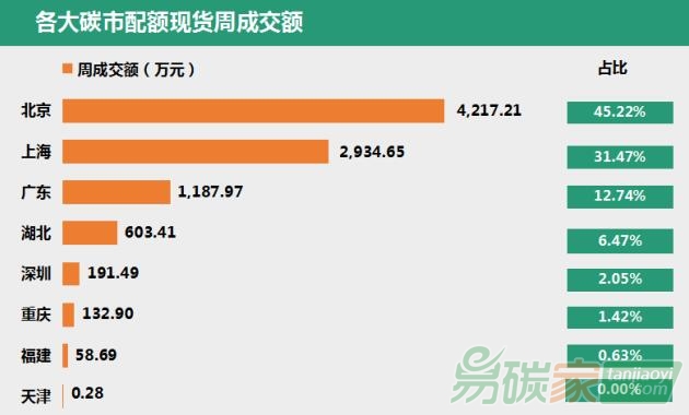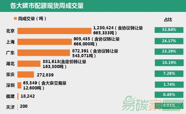 北京6月5日協(xié)議轉(zhuǎn)讓額)。其中,上海碳市配額現(xiàn)貨交易明顯活躍,周成交量(905,435噸)較前一交易周(9,519噸)大幅攀升;天津碳市時(shí)隔兩個(gè)半月后再現(xiàn)配額交易。各大碳市配額現(xiàn)貨交易情況請(qǐng)見下表: