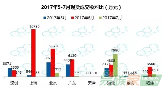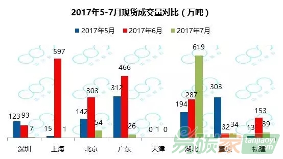 深圳成交6.9萬噸,與6月相比下降92.6%;上?,F(xiàn)貨成交1萬噸,比6月下降99.8%;北京成交54.1萬噸,與6月相比下降82.2%;廣東成交26萬噸,與6月相比下降94.4%;天津無交易;湖北成交619.1萬噸,與6月相比上升了115.6%;重慶成交33.8萬噸,與6月相比上升了4.5%;福建成交39.3萬噸,比6月下降74.4%。
