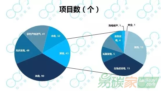 從項(xiàng)目類別看,已獲得減排量備案且材料公示的254個(gè)項(xiàng)目中,有第一類項(xiàng)目139個(gè),合計(jì)備案減排量1890萬噸CO2e;第二類項(xiàng)目17個(gè),備案減排量372萬噸CO2e;第三類項(xiàng)目98個(gè),備案減排量3031萬噸CO2e。從項(xiàng)目類型看,風(fēng)電、光伏、農(nóng)村戶用沼氣、水電等項(xiàng)目較多,詳細(xì)情況如下圖所示。