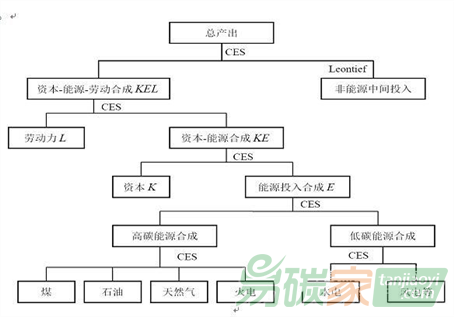 石化 能源(石化能源進一步細分為煤炭、石油和天然氣),采用多層CES函數(shù)嵌套方式進行組合,并從碳稅征收方式和碳稅使用方式上綜合模擬分析碳稅及相關(guān)二氧化碳減排問題。