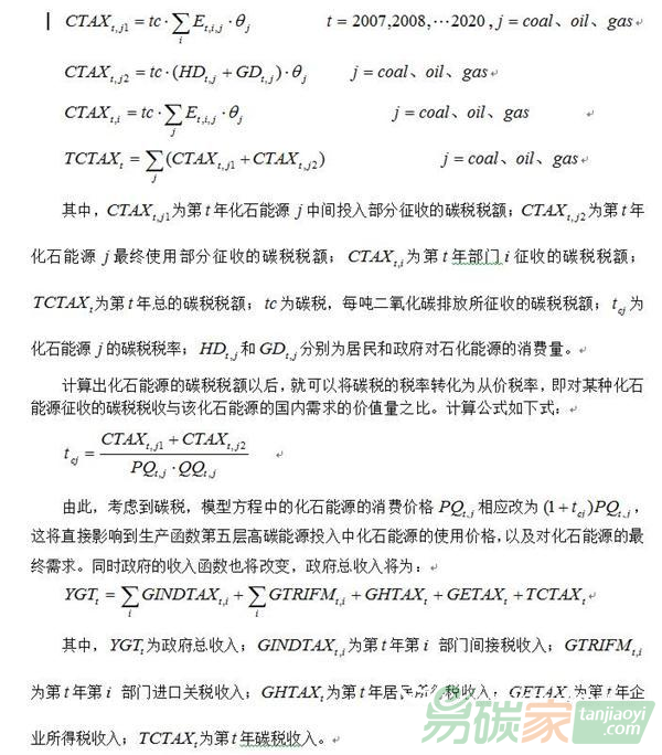 本文應(yīng)用CGE模型進行政策模擬中,計稅依據(jù)為CO2排放量,并且采用國際常用的在化石能源使用環(huán)節(jié)征稅方式,具體碳稅設(shè)計為以下方程所示: