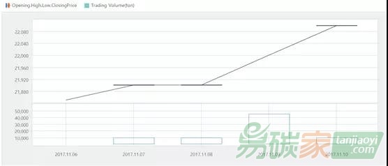2017年11月6日至2017年11月12日,韓國碳市場價格在21850-22100韓元/噸之間(約19.54-19.76美元/噸)。