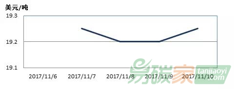 2017年11月6日至2017年11月12日新西蘭碳單位(New Zealand Unit, NZU)的現(xiàn)貨價格在19.2-19.25美元/噸之間。