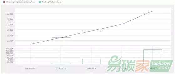 2018年5月14日至2018年5月20日,韓國碳市場價格在22050-22300韓元/噸(約20.37-20.60美元/噸)之間波動。
