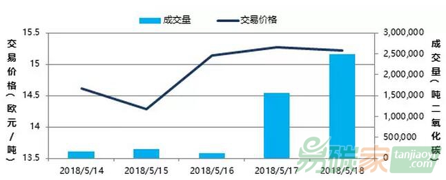 2018年5月14日至2018年5月20日,歐盟碳市場日交易均價在14.29-15.27歐元/噸之間波動。