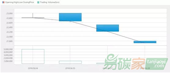 2018年6月4日至2018年6月8日,韓國碳市場價格在21700-22800韓元/噸(約20.22-21.25美元/噸)之間波動。