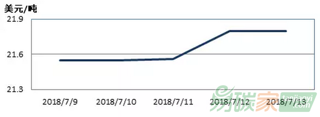 2018年7月9日至2018年7月15日,新西蘭碳單位(New Zealand Unit, NZU)的現(xiàn)貨價(jià)格在21.55-21.8美元/噸之間。