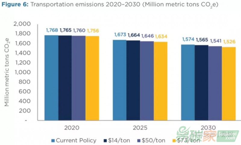 第二,碳稅對(duì)電力部門(mén)的煤電廠影響最大(煤電廠加速退役),到2030年因?yàn)樘级悓?shí)現(xiàn)的減排量中80%來(lái)自電力部門(mén)。如果碳稅為50美元/噸,那么2030年電力部門(mén)碳排放為6.76億噸,比沒(méi)有碳稅的情境下的排放量降幅達(dá)61%。而50美元/噸的碳稅對(duì)于交通部門(mén)的減排量影響非常小(-2%)。