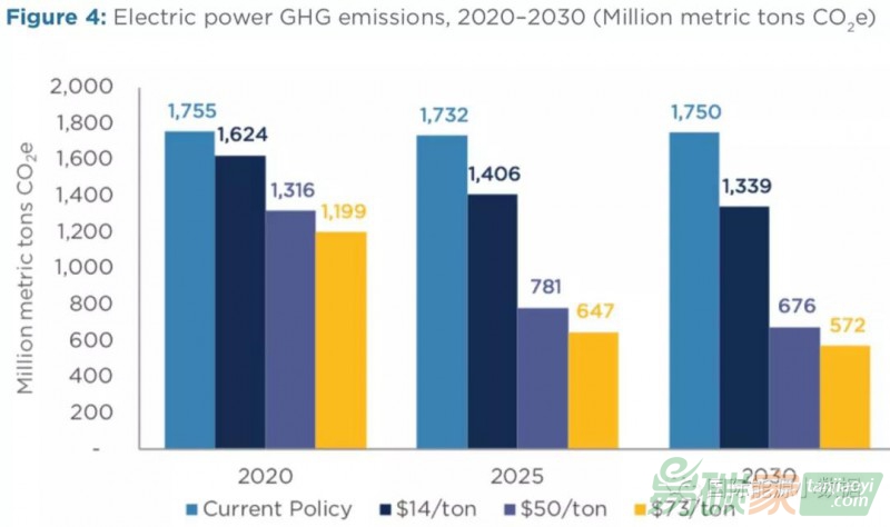 第一,碳稅有助于減排,但是需要達(dá)到較高的碳價(jià)水平才能充分發(fā)揮作用。如果碳稅達(dá)到50美元/噸的時(shí)候,美國(guó)2025年代碳排放量將比2005年下降39%-46%(美國(guó)奧巴馬政府的減排目標(biāo)是26%-28%)。如果2050年代減排目標(biāo)是比2005年下降80%,那么屆時(shí)碳稅需要超過(guò)100美元/噸。