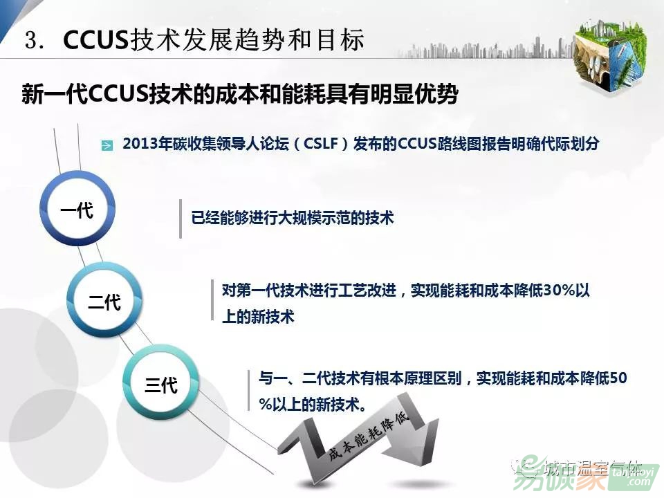 新一代CCUS技術(shù)的成本和能耗具有明顯優(yōu)勢。CCUS有的還處于研發(fā)階段,有的還是概念,但是有的已經(jīng)應(yīng)用了。CSLF在2013年CCUS路線圖報(bào)告中提出,一代技術(shù)是現(xiàn)階段已經(jīng)能夠進(jìn)行大規(guī)模示范的技術(shù),二代是技術(shù)成熟后實(shí)現(xiàn)能耗和成本比一代技術(shù)降低30%以上的新技術(shù),三代與一、二代技術(shù)有根本原理區(qū)別,能耗成本實(shí)現(xiàn)降低50%。