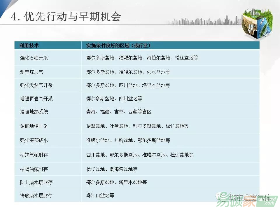 同時(shí)針對(duì)不同地區(qū)的排放源和封存利用的適合產(chǎn)地,進(jìn)行了相應(yīng)的組合,對(duì)未來產(chǎn)業(yè)集群和大規(guī)模示范,一些早期的機(jī)會(huì)進(jìn)行了識(shí)別,分別針對(duì)不同的區(qū)域,包括
