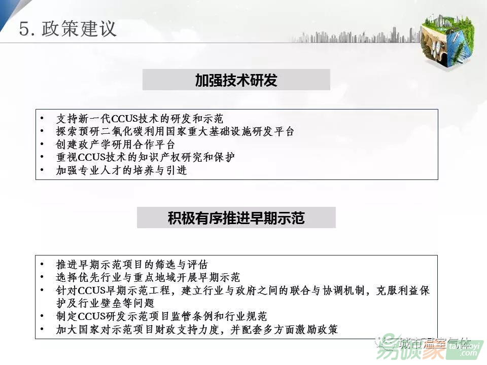 第二個(gè)方面的建議是關(guān)于早期示范。包括推進(jìn)早期示范項(xiàng)目的篩選與評(píng)估,成本比較低的排放氣源,能產(chǎn)生經(jīng)濟(jì)效益的利用手段等,能夠結(jié)合,然后對(duì)相應(yīng)的技術(shù)進(jìn)行測試、示范,從而推進(jìn)技術(shù)鏈條的發(fā)展。針對(duì)早期示范工程,也是要加強(qiáng)行業(yè)和政策部門之間的協(xié)調(diào),包括環(huán)境部通過環(huán)境影響評(píng)價(jià),推動(dòng)相關(guān)行業(yè)間的合作等推動(dòng)技術(shù)發(fā)展,還包括提供相關(guān)財(cái)政激勵(lì)等。產(chǎn)業(yè)政策方面提出建議把CCUS納入國家戰(zhàn)略新型產(chǎn)業(yè),提前開展相關(guān)法律法規(guī)的研究。還有就是加強(qiáng)相關(guān)的國際合作,包括政府間、民間都值得加強(qiáng)交流合作,各位有機(jī)會(huì)去發(fā)達(dá)國家建成示范項(xiàng)目考察學(xué)習(xí)都是需要開展的工作。