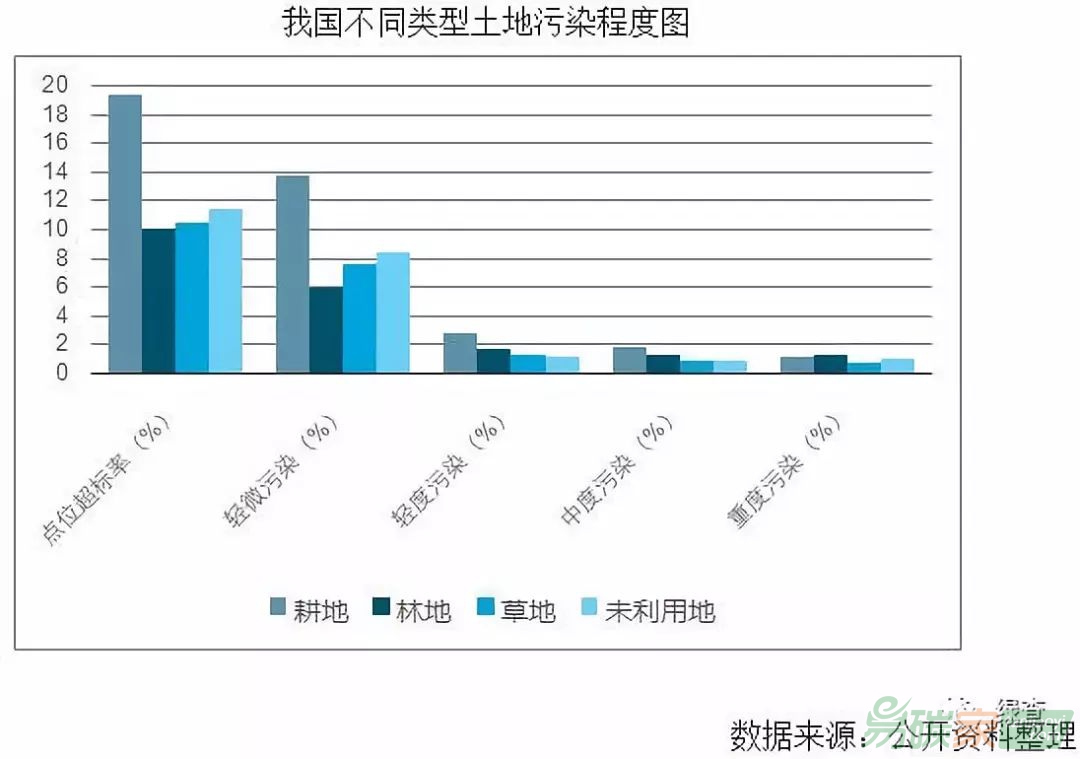 從土地類型來看,耕地的點位超標(biāo)率最高,達(dá)到了19.4%,而其他三種土地的超標(biāo)率略高于10%的水平。耕地直接涉及到我國的食品安全問題,這也是近年來土地污染問題越來越受到群眾關(guān)心的重要原因。