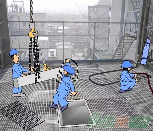 某年3月16日下午,某廠在除塵器6m倉(cāng)泵平臺(tái)進(jìn)行設(shè)備安裝,切割一孔洞(2×3m),未加裝臨時(shí)圍欄。作業(yè)中,在將設(shè)備向已開(kāi)好的6m平臺(tái)孔洞移動(dòng)時(shí),設(shè)備的一角觸到鋼結(jié)構(gòu)支柱,無(wú)法繼續(xù)下放。作業(yè)人員加設(shè)手動(dòng)葫蘆以調(diào)整設(shè)備的位置,李某在用鋼絲繩進(jìn)行綁縛時(shí),鋼絲繩突然彈開(kāi),退后躲閃時(shí)一腳踩空,從平臺(tái)孔洞墜落,造成左鎖骨骨裂。