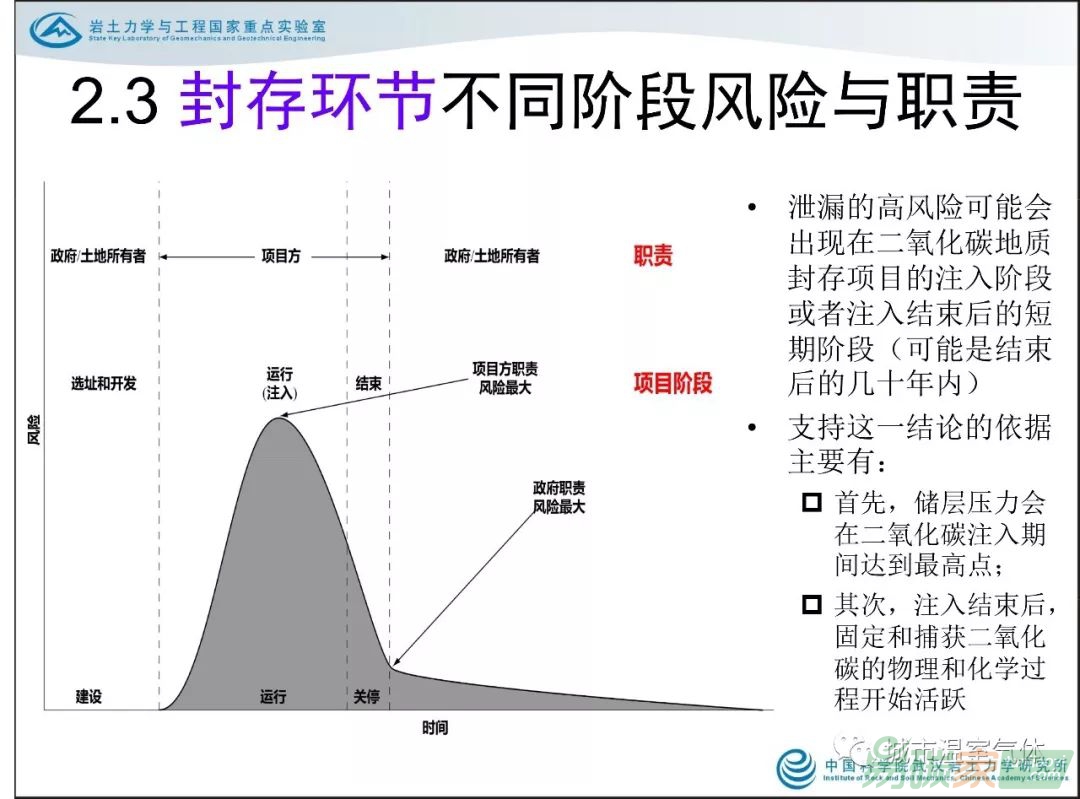 這個(gè)圖主要說(shuō)明了二氧化碳在整個(gè)工程時(shí)間上的風(fēng)險(xiǎn)量級(jí)。一般劃分為三個(gè)階段,首先是注入前,二是注入過(guò)程,三是注入后,有時(shí)也分四個(gè)階段,就是關(guān)閉后的過(guò)程。我建議采用比較簡(jiǎn)單的三階段劃分,我們現(xiàn)在也是這樣做的。