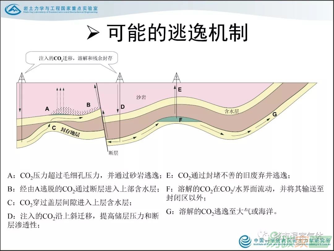 這個(gè)圖上午也講了,二氧化碳注入到地下,存在可能的泄漏通道,會(huì)跑。首先是沿著井筒跑,因?yàn)槭菑木谧⑷脒M(jìn)去的,封不好就跑出來(lái),即使封得好,二氧化碳遇水形成碳酸等溶液腐蝕了井筒也可以跑出來(lái),井筒是主要的泄漏點(diǎn)。不僅注入井,還有廢氣井也是潛在泄漏通道。其次,還有沿著斷裂帶,深藍(lán)色的地方,二氧化碳沿著斷裂帶上溢出來(lái),也是需要加強(qiáng)監(jiān)控的。這是比較快速的泄漏。最后,還有二氧化碳會(huì)慢慢滲透過(guò)蓋層,像呼吸一樣慢慢往淺地表擴(kuò)散。上午講的尼斯湖事件,因?yàn)槭腔鹕胶?,二氧化碳到達(dá)湖底以后,慢慢積聚,最后噴出來(lái)了。