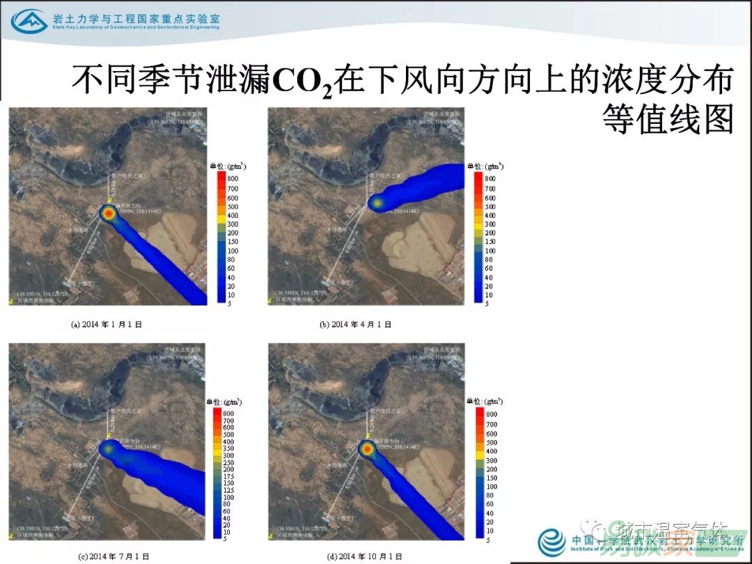 這四張圖,二氧化碳到地表以后,在大氣的擴(kuò)散過(guò)程,在鄂爾多斯地區(qū)常年主風(fēng)向情況下,30000ppm和50000ppm濃度暈擴(kuò)散的情況。在30000ppm的時(shí)候基本不用擔(dān)心跑到農(nóng)戶家里,如果發(fā)生風(fēng)險(xiǎn),切實(shí)能夠應(yīng)對(duì)。