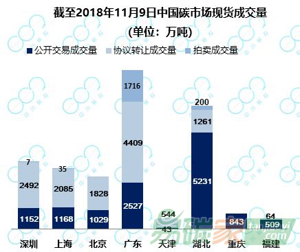 截至2018年11月9日,8個區(qū)域碳市場一、二級現(xiàn)貨市場累計成交2.71億噸,成交額60.33億元。廣東、湖北成交量最高,位于第一梯隊;深圳、上海、北京位于第二梯隊;而天津、重慶、福建的成交量相對較低,位于第三梯隊。
