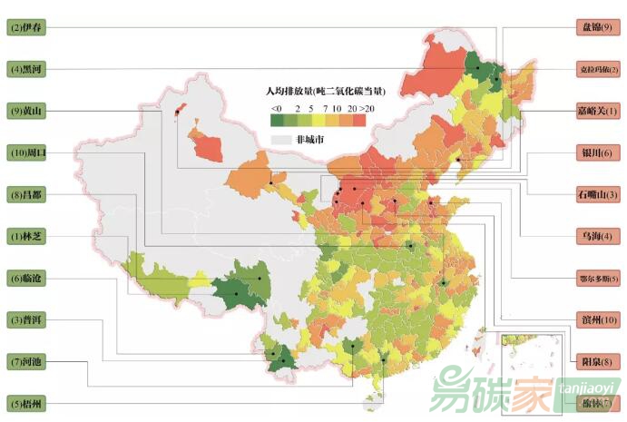 注:綠色文字框標(biāo)注人均排放最低的10個(gè)城市(數(shù)字代表排序從小到大),橘紅色文字框標(biāo)注人均排放最高的10個(gè)城市(數(shù)字代表排序從大到?。?。