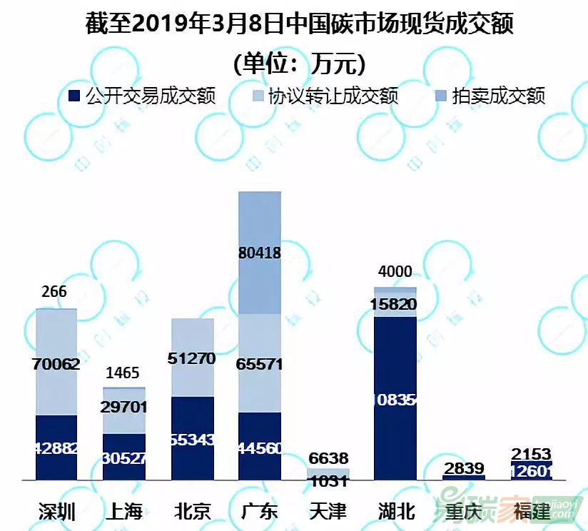 截至2019年3月8日,8個區(qū)域碳市場一、二級現(xiàn)貨市場累計成交2.87億噸,總成交額62.57億元。廣東、湖北成交量最高,位于第一梯隊;深圳、上海、北京位于第二梯隊;而天津、重慶、福建的成交量相對較低,位于第三梯隊。
