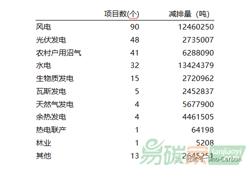 減排量備案項目287個。獲得減排量備案的項目中掛網(wǎng)公示254個,合計備案減排量5283萬噸CO2e。從項目類別看,已獲得減排量備案且材料公示的254個項目中,有第一類項目139個,合計備案減排量1890萬噸CO2e;第二類項目17個,備案減排量372萬噸CO2e;第三類項目98個,備案減排量3031萬噸CO2e。從項目類型看,風(fēng)電、光伏、農(nóng)村戶用沼氣、水電等項目較多,詳細情況如下圖所示: