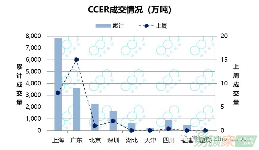 四川CCER市場持續(xù)保持活躍,其中上海CCER市場成交量最高,累計成交8萬噸;其次為深圳,CCER累計成交2萬噸;四川CCER市場成交0.4萬噸。上周廣東和北京各發(fā)生一筆CCER交易,分別成交8萬噸和1萬噸,其他試點地區(qū)CCER市場無成交。截至2019年4月4日,全國CCER累計成交1.77億噸,其中上海的CCER累計成交量最高,達7841萬噸,占全國成交量的44%;廣東、北京、深圳位列第二梯隊,CCER累計成交量在1500萬噸~4000萬噸之間;湖北、天津、四川、福建位列第三梯隊,CCER累計成交量在200萬噸~1000萬噸之間;重慶CCER無成交。