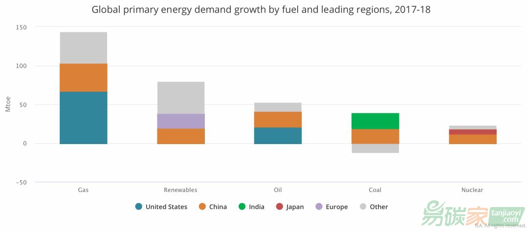碳排放的反彈源于能源消費的增長,2018年全球一次能源消費比2017年增長2.3%,是2010年以來平均增長速率的一倍多。具體而言,全球2018年化石能源消費增長2.24億噸、可再生能源增長0.81億噸、核能0.23億噸標準油當量。
