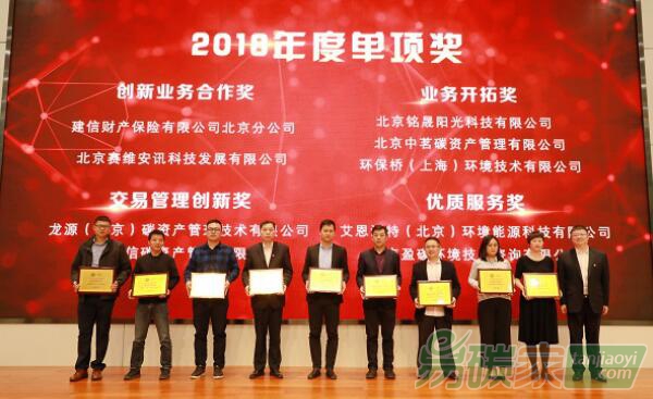 認(rèn)證集團(tuán)股份有限公司、中碳能投科技(北京)有限公司等獲選環(huán)交所2018年度“十佳會員”。九家企業(yè)榮獲四個(gè)單項(xiàng)獎(jiǎng),北京賽維安訊科技發(fā)展有限公司、建信財(cái)產(chǎn)保險(xiǎn)有限公司北京分公司獲得“創(chuàng)新業(yè)務(wù)合作獎(jiǎng)”,龍?jiān)矗ū本┨假Y產(chǎn)管理技術(shù)有限公司、上海置信碳資產(chǎn)管理有限公司獲得“交易管理創(chuàng)新獎(jiǎng)”,北京銘晟陽光科技有限公司、北京中茗碳資產(chǎn)管理有限公司 、環(huán)保橋(上海)環(huán)境技術(shù)有限公司獲得“業(yè)務(wù)開拓獎(jiǎng)”,艾恩沃特(北京)環(huán)境能源科技有限公司、上海盈碳環(huán)境技術(shù)咨詢有限公司獲得“優(yōu)質(zhì)服務(wù)獎(jiǎng)”。龍?jiān)矗ū本┨假Y產(chǎn)管理技術(shù)有限公司總經(jīng)理魏子杰、國泰君安證券股份有限公司固定收益外匯商品部