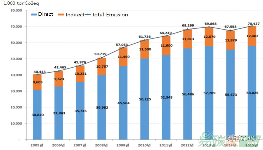 從1990年到2015年,我們一直在跟蹤韓國(guó)溫室氣體排放情況,2015年全國(guó)溫室氣體排放總量與20世紀(jì)90年代相比增加了135%,與2014年相比增加了0.2%。自2013年開(kāi)始,總體排放緩慢下降。