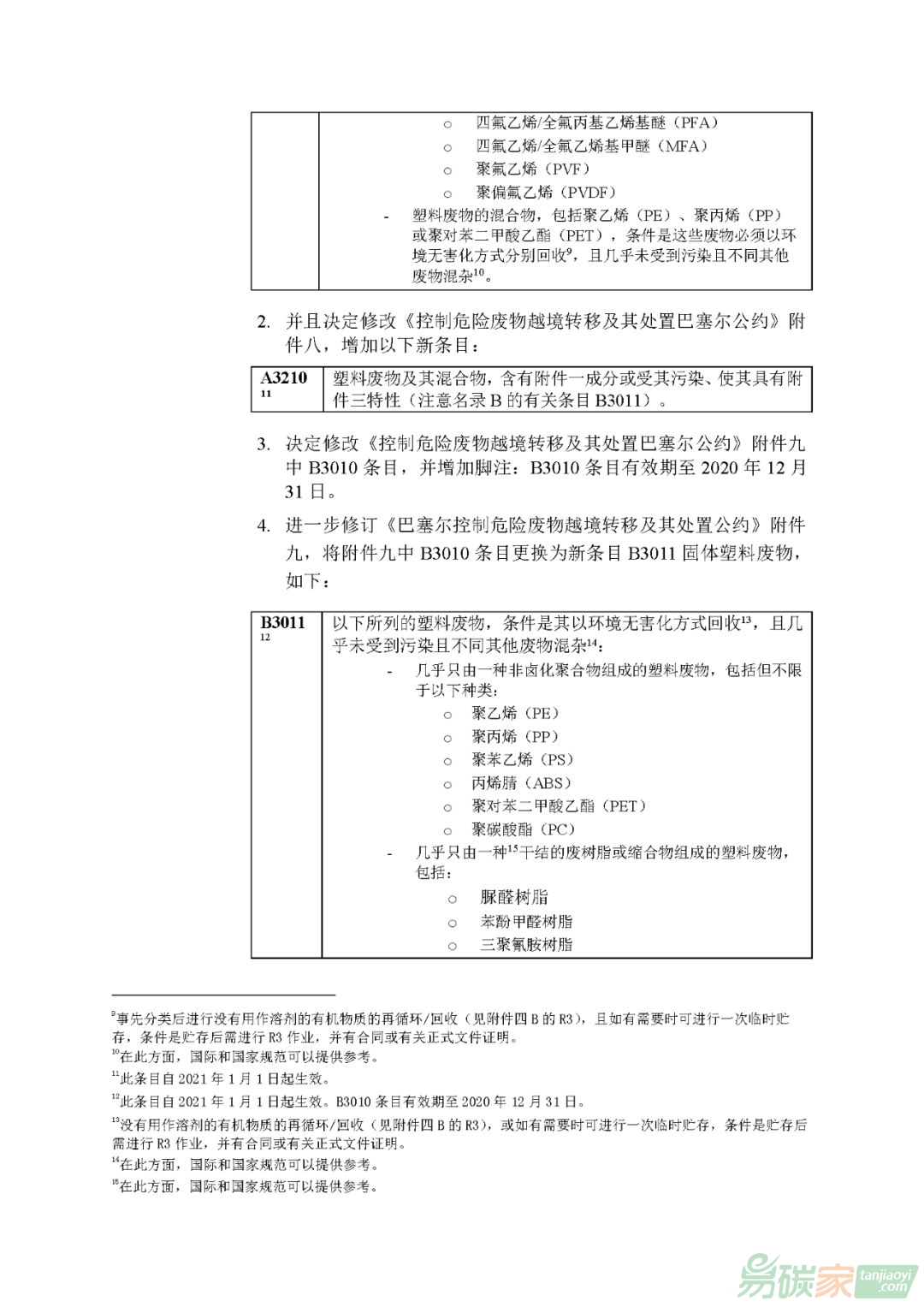 三是增加了列入附件九的塑料廢物最終應(yīng)進(jìn)行環(huán)境無(wú)害化回收的要求。