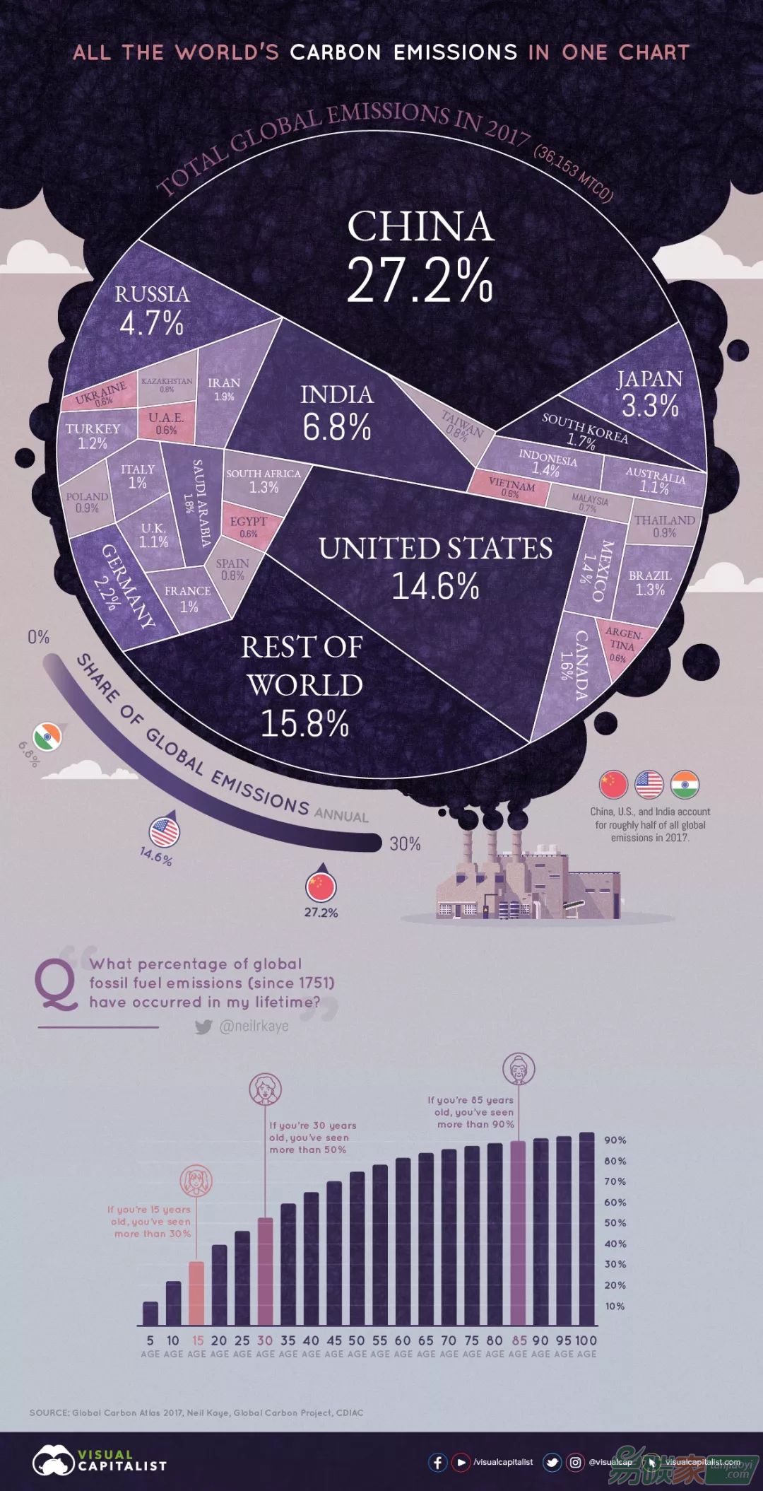 根據(jù)Global Carbon Atlas匯總的計(jì)算的數(shù)據(jù),2017年全球