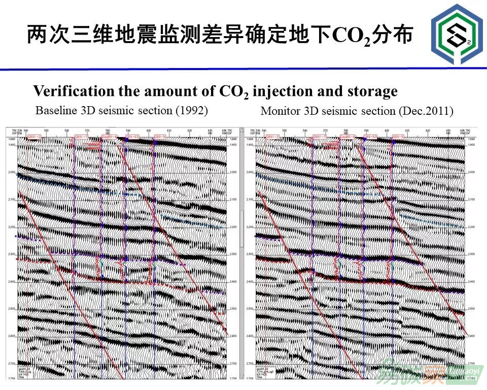 研究人員做了監(jiān)測以后,知道二氧化碳的分布區(qū),紅顏色代表它的分布區(qū),所以知道二氧化碳分布在什么地方,選取在此處注入。