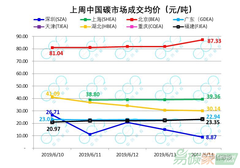 在連續(xù)兩周發(fā)生交易的區(qū)域市場中,上周湖北市場價(jià)格明顯下降,降幅超過35%;深圳市場價(jià)格下降了13%;福建市場價(jià)格略有上漲,漲幅近18%;其他試點(diǎn)市場價(jià)格較前一周表現(xiàn)穩(wěn)定,浮動范圍均未超過10%。上周重慶、天津配額市場線上無成交。