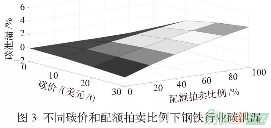 在本文假定的正常情景下,碳市場對鋼鐵行業(yè)的影響有限,其中國內(nèi)產(chǎn)品價格上升0.47%,出口產(chǎn)品價格上升0.46%,整體產(chǎn)量下降0.60%。當(dāng)配額拍賣比例低于30%,配額價格低于30美元/t CO2時,鋼鐵行業(yè)的價格和產(chǎn)量的變化幅度都不會超過5%,而整體行業(yè)的CO2排放卻能降低20%以上。未來我國推行碳交易所引發(fā)的鋼鐵行業(yè)碳泄漏率相對變化比較穩(wěn)定,雖然目前鋼鐵行業(yè)的碳泄漏不高,但仍要保持高度關(guān)注。