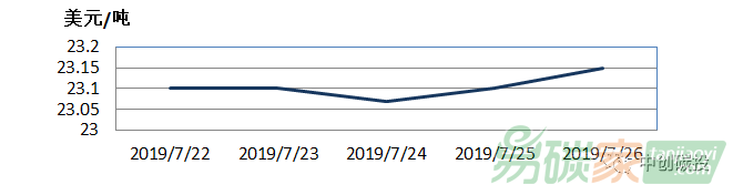 新西蘭碳市場2019年07月22日至2019年07月28日,新西蘭碳市場價格在23.07-23.15美元/噸之間波動。